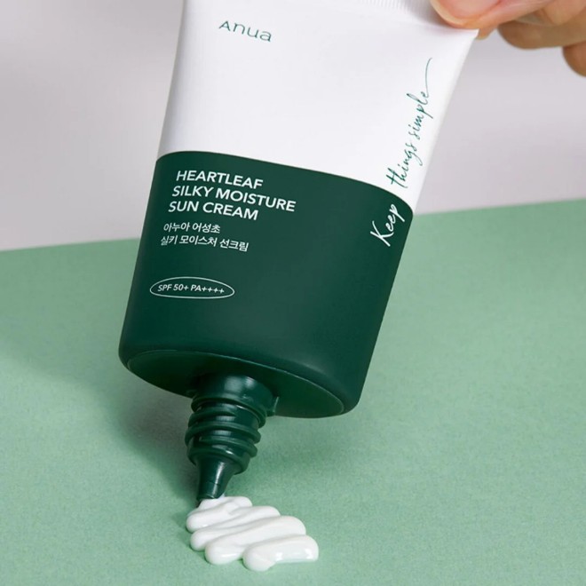 Anua Heartleaf Silky Moisture Sun Cream SPF50+ PA++++ is a daily sunscreen formulated with Heartleaf (Houttuynia Cordata) Extract to provide high sun protection while calming and hydrating the skin. This sunscreen protects against both UVA and UVB rays and helps to soothe sensitive, acne-prone skin. It features a lightweight, silky texture that spreads easily without leaving a white cast or greasy finish, making it ideal for layering under makeup. Enriched with plant-derived squalane and panthenol, it locks in moisture and reinforces the skin barrier.